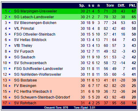 SG Marpingen-Urexweiler: M. Ziegler - J. Klos - J. Maas - M. Rauber - L. Schummer - T. Straß - J. Born - M. Gebhard - S. Recktenwald - N. Biegel - S. Reis; Spielerwechsel: Peter Wilhelm für Simon Reis (76.), Yannick Schnur für Sören Recktenwald (73.), Julian Klos für Noah Biegel (68.)