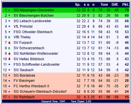 In einem umkämpften Verbandsliga-Spiel setzte sich der FV Biesingen vor 150 Fußballfans mit 2:1 gegen den Meister der SG Marpingen-Urexweiler durch. Früh brachte Björn Recktenwald die Gäste in Führung, als er in der 11. Minute mit einem Distanzschuss das 0:1 erzielte. Biesingen kämpfte sich zurück und glich in der 66. Minute durch Dominik Schokies aus, der nach einem Alleingang mit Torabschluss erfolgreich war. Die Vorlage zu diesem Treffer lieferte Hendric Bier, der damit seine fünfte Saisonvorlage beisteuerte. In der Schlussphase sorgte ein unglückliches Eigentor von Jannis Maas in der 87. Minute für die Entscheidung zugunsten von Biesingen. Neben den Toren gab es zahlreiche Wechsel auf beiden Seiten, die für frischen Wind sorgten. So wechselte Biesingen unter anderem Hendric Bier für Naim Güclü (60.) sowie Steven Becker für Yannik Stopp (80.) ein, während die SG Marpingen-Urexweiler unter anderem Sören Recktenwald für Julian Klos (75.) brachte. Das Spiel wurde von intensiven Zweikämpfen geprägt, wobei Biesingen besonders in der zweiten Halbzeit die besseren Chancen hatte. Letztlich sicherte der späte Eigentor-Treffer den Heimsieg für Biesingen. Der FV Biesingen kann durch den Sieg zumindest die Hoffnung auf den Klassenerhalt wahren und steht mit 28 Punkten auf Rang 14 der Tabelle.