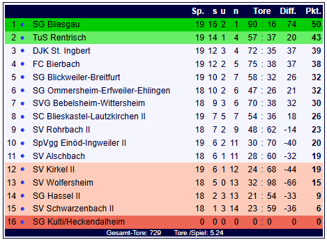 Mit dem Erfolg festigt die SG Bliesgau ihre Tabellenführung in der Bezirksliga Bliestal und steht nach 19 Spielen bei 50 Punkten und einem beeindruckenden Torverhältnis von 90:16. Der SC Blieskastel-Lautzkirchen II bleibt mit 26 Punkten im Tabellenmittelfeld auf Rang acht.