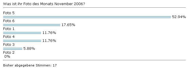 Wie schon gesagt startet natürlich wieder die Wahl zum "Foto des Jahres 2006". Qualifiziert sind wie immer alle Fotos des Monats, sowie die drei bestplatzierten Zweiten. Also viel Spaß bei der Wahl: