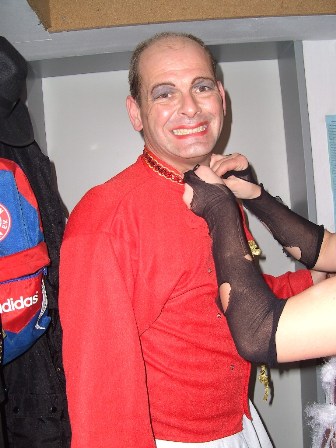 Hinter der Bühne sieht der Bimsball schon ein wenig anders aus, als für die fast 400 Zuschauer in der Halle: Da werden Kostüme angezogen, Akteure geschmicnkt, der Auftritt ein letztes Mal geprobt und auch kleine Späße kurz vorm Auftritt kommen natürlich nicht zu kurz. Auch die Kostümproben können da, je anch Akteur, schon mal äußerst unterschiedlich aussehen: