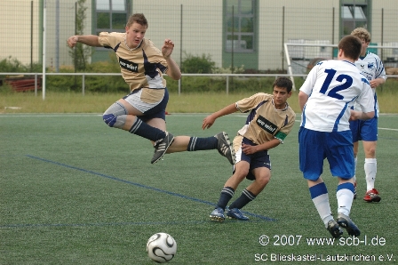 Das Jugendsportfest 2007 des SCB ist eröffnet: Die B-Jugendmannschaften aus Blieskastel-Lautzkirchen, Ommersheim, Herbitzheim und Blickweiler boten bei ihrem Turnier am Freitagabend den ersten Höhepunkt des noch jungen Wochenendes: Das B-Jugenturnier war spannend bis zum Ende und hatte mit dem SV Blickweiler einen würdigen Sieger. Zwei Siege und ein Unentschieden standen für den Turniersieger nach drei absolvierten Partien zu buche, so dass man verdientermaßen an der Spitze der Tabelle stand. Auf dem zweiten Platz der Endabrechnung folgte dann der SCB, der mit 4 Punkten aus drei Partien ebenfalls eine tolle Leistung ablieferte, zumal man sich auch gegen den späteren Turniersieger vom SVB nur denkbar knapp mit 0:1 geschlagen geben musste.