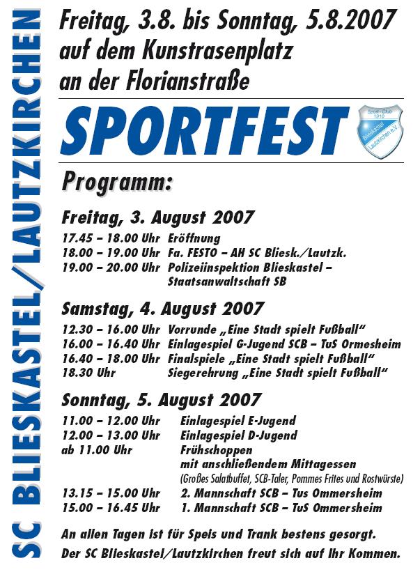 Das Sportfest des SC Blieskastel-Lautzkrichen findet in diesem Jahr vom 3. bis zum 5. August 2007 auf der Kunstrasenanlage an der Florianstraße statt. Am Freitag startet das Sportfest mit zwei Einlagespielen: Nach der Eröffnung um 17:45 Uhr misst sich zunächst das Team der FESTO in Rohrbach mit der AH des SC Blieskastel-Lautzkirchen, bevor dann die Polizei Blieskastel gegen die Staatsanwaltschaft Saarbrücken antritt. Der Samstag steht dann wie im Vorjahr ganz im Zeichen der Hobbyfußballer aus Blieskastel: