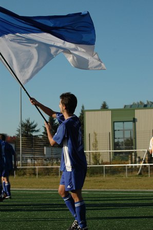 Frank Konrad feiert den Sieg gegen Rohrbach mit einer Fahne aus dem Fanclub