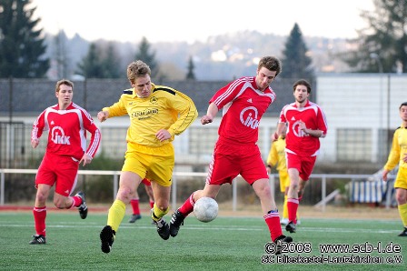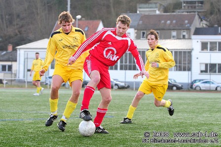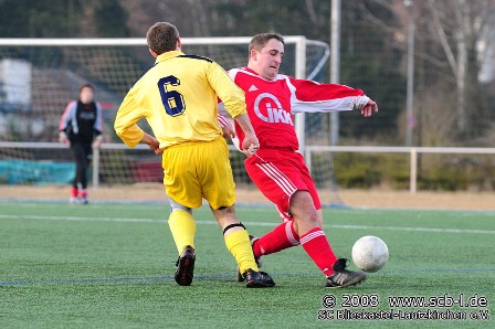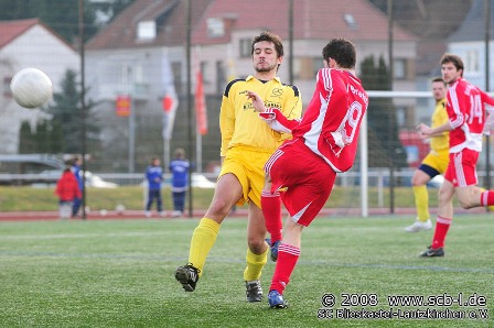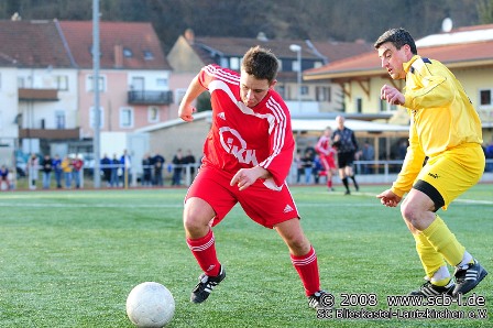 Das Nachholspiel aus der Hinrunde macht es möglich: Blieskastels Start ins neue Fußballjahr 2008 fand auf eigenem Platz an der Florianstraße statt und zu Gast beim im abgelaufenen Kalenderjahr zumeist heimstarken SC war an diesem ersten Spiel der Lokalrivale vom SV Breitfurt. Die Lokalderbys gegen den SV gestalteten sich in den Vorjahren zumeist eng, waren hart umkämpft und endeten auch oftmals Unentschieden mit einer Punkteteilung, die keinem so richtig weiterhelfen konnte. So glaubten nicht wenige, dass es auch an diesem Auftakt ins neue Jahr ein harter Weg für den SC werden sollte, der womöglich auch nicht unbedingt von Erfolg gekrönt sein könnte, waren doch die Leistungen in der Vorbereitung nicht immer nur überzeugend. Aber nun ist passiert, was sooft nach einer Vorbereitung geschieht: Die Statistiken der Vorbereitungsspiele kann man getrost in die Mülltonne werfen und die Jungs vom SC haben auf den Punkt bewiesen, dass die Form zu stimmen scheint, obwohl die Ausgangssituation alles andere als ideal war: Wieder musste der SC kurzfristige Ausfälle kompensieren, wieder agierte man in veränderter Grundformation und wieder kamen die Jungs vom SC damit besser zurecht als zu vermuten gewesen wäre. Allen Befürchtungen zum Trotz: Blieskastel präsentierte sich von der ersten Minute an konzentriert und schaffte es dem SV das eigene Spiel aufzuzwängen. Ein Tor von Jörg Leonhardt nach 10 Minuten lenkte dann die Partie endgültig in die Richtung, die man sich Seitens des SC im Vorfeld erhofft hatte: Spätestens jetzt wirkte der SV konsterniert und schockiert, hatte kaum noch eigene Aktionen und die Hausherren aus Blieskastel konnten das Tor der Gäste ein ums andere Mal gefährlich unter Beschuss nehmen: Nur 8 Minuten nach dem 1:0 war es SC-Angreifer Alex Schneider, der aus schwieriger Position zum 2:0 für den SC einsetzte. Blieskastel war nun an der heimischen Florianstraße endgültig Herr der Lage und Breitfurt fand in der Offensive kaum noch statt. War die Partie etwa schon zu Pause entschieden? Gerade als sich die SC-Fans und offensichtlich auch die Akteure selbst auf eine sichere 2:0 Pausenführung eingestellt hatten, dann der Schock: Ein Elfmeter, nach einem unnötigen Ballverlusts sollte die bis dahin harmlosen Gäste nur eine Minute vor dem Pausenpfiff auf 2:1 heranbringen. Nun ging es trotz guter erster Hälfte des SC mit Fragezeichen auf der Stirn in die Kabine: Würde Breitfurt etwa noch einmal in die Partie zurückkommen und dem SC den Start ins Jahr 2008 vermasseln?