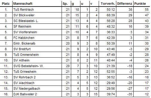 Die überraschende Niederlage des SV Blickweiler spielte natürlich dem SCB in die Karten: Der SC gewann sein Heimspiel gegen das Schlusslicht aus Ballweiler-Wecklingen II mit 5:1 und rückt damit bis auf 4 Punkte an den zweiten Tabellenplatz. Auch wenn es nur für Statistik ist, weil bekanntermaßen nur der erste und der letzte Platz der Tabelle von Bedeutung ist, so kann man sich zumindest das Ziel setzen den Rückstand sukzessive zu verkleinern. Wieder auf Kur kamen dagegen die Sportfreunde aus Reinheim: Die SFR gewannen ihr Heimspiel gegen die SVG Bebelsheim-Wittersheim eine hart umkämpfte Partie am Ende mit 4:2 und kann die vierte Tabellenposition zunächst behaupten. Gut für Reinheim, dass der Tabellenfünfte aus Wolfersheim Federn lies: Die Wölfe verloren ihr Heimspiel gegen den FC Habkirchen mit 0:4. Ebenfalls siegreich war der SV Breitfurt: Breitfurt konnte in Niedergailbach das torreichste Spiel des Tages mit 6:3 gewinnen. Auch der SV Rohrbach konnte sich über ein klares 4:1 gegen den SV Alschbach freuen. Mit dem selben Ergebnis gewann der TuS Ormesheim gegen den SV Altheim. Rohrbach II konnte sich mit seinem Sieg an Aslchabch und Niedergailbach vorbei auf den viertletzten Tabellenplatz verbessen. Damit hat die DJK Ballweiler-Wecklingen II schon 5 Punkte Rückstand auf das ersehnte rettende Ufer.