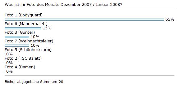 Wieder haben unsere User das Foto des Monats gewählt. Diesmal standen die besten Fotos der Monate Dezember 2007 und Januar 2008 zur Wahl und selbstverständlich stand die Wahl ganz im Zeichen des SCB Bimsball 2008-SE. einen überagenden Erdrutschsieg feierte Damit der bodyguard von take-that alias Alex Dell, der sicherlich auch gute Chancen für die Abstimmung zum foto des Jahre 2008 hat...