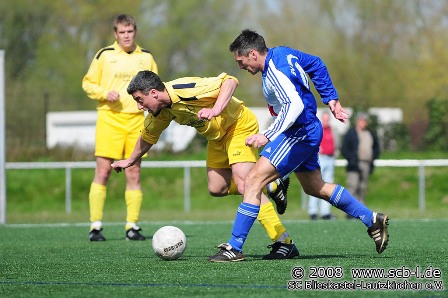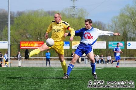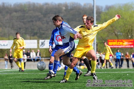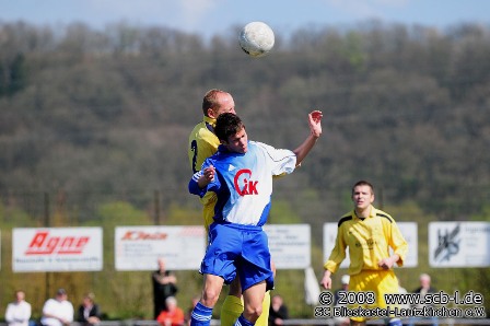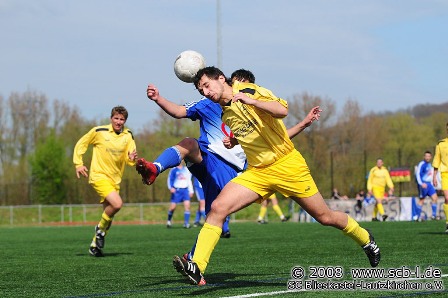 Was gibt es Schöneres: 20°C, Sonnenschein, zwei Lokalderby, 6 Punkte, ein Spitzenreiter und zu allem Überfluss noch ein neuer Zweiter… Das Wochenende sollte für den SC fast schon zu perfekt sein, waren doch die Nerven vor dem Lokalkampf gegen den SV Blickweiler recht angespannt. Zu präsent waren auf Seiten des SC noch die Bilder von feiernden Blickweilern, nachdem sie den SC in den 90 Minuten zuvor auf dem Rasenplatz des SVB vorgeführt hatten. Wiedergutmachung musste her und will man dieses etwas negativ belegte Wort im Sport überhaupt verwenden: Die Revanche auf eigenem Platz sollte her. Der SC zeigte gegen die Gäste im viel propagierten „Spiel um Platz 2“ von der ersten Minute an genau das Engagement, dass man im Hinspiel schmerzlich vermissen lies.Die seit 12 Spielen ungeschlagenen Blieskastler kombinierten gefällig und waren in den Zweikämpfen oft den entscheidenden Schritt schneller als die etwas passiv agierenden Gäste aus Blickweiler. Trotzdem war es wie sooft: Blieskastel erspielte sich durch schnelles Direktspiel Möglichkeiten, lies aber einen Großteil davon auf der Strecke. Aufatmen dann bei den zahlreichen SC-Fans an der Florianstraße, als ausgerechnet einer der Kleinsten in den Reihen des SC, Flavio Baier, per Kopf das hochverdiente 1:0 für den SC erzielen konnte. Blickweiler dagegen agierte nervös und hatte in der Offensive nur durch Standardsituationen und Angriffe über den schnellen Außenbahnen gefährlich. Blieskastel war seinerseits ballsicherer und somit ging es mit einer verdienten, allerdings auch denkbar knappen Führung in die Pause.