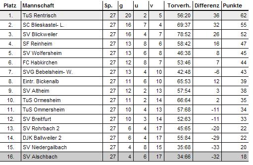 Alschbach bleibt damit mit 18 Zählern Schlusslicht der Tabelle, davor residiert der SVN mit 20 Punkten und auf den Plätzen 13 und 14 stehen die zweiten der Landesligisten aus Rohrbach und Ballweiler-Wecklingen mit jeweils 22 Punkten.