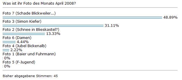 Der erste Titel für die Erste in der neuen Saison 2008/2009 ist perfekt: "Schade Blickweiler..." so der Untertitel des "Fotos des Monats April 2008". Das Foto vom Jubel der SCler nach dem 3:2 Erfolg über den SV Blickweiler konnte sich mit einer fast 50-prozentigen Mehrheit durchsetzen und darf sich somit in die Reihe der "Fotos des Monats" einreihen und nicht zuletzt an der Wahl zum "Foto des Jahres 2008" teilnhemen. Hier nochmals das Siegerfoto und das Endergebnis der Wahl: