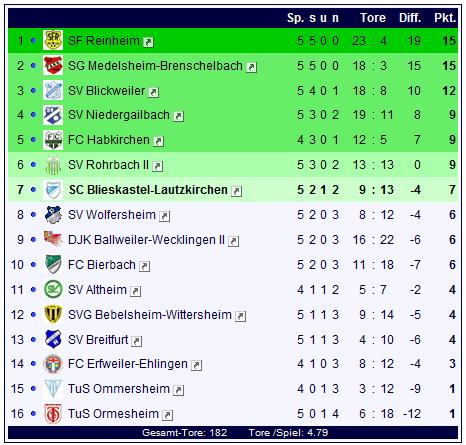 Auch in der Tabelle bleibt damit ganz oben alles beim Alten: 23:4 Tore, 15 Punkten aus 5 Spielen bedeuten natürlich Platz eins für die SFR und sorgen für mächtig Respekt bei den Gegnern. Einer der Verfolger bleibt nach wie vor der SV Blickweiler: In der Vorwoche musste man sich den Sportfreunden aus Reinheim mit 3:4 geschlagen geben und die Frage war, wie der SVB, der unter der Woche als einzige A-Ligist aus dem Bliestal in die 2. Zwischenrunde des Saarlandpokals einzog, diesen Rückschlag verkraftet hatte. In Bebelsheim sahen die SVB-Anhänger eine knappe Partie, die aber mit einem Happy-End für den SVB endete: Blickweiler gewann sein Gastspiel in Bebelsheim am Ende mit 3:2 Toren und bleibt damit den SFR mit drei Punkten Rückstand weiter auf den Fersen.
