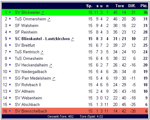 Herbstmeister ist also der SV Blickweiler. Der SCB belegt einen beachtenswerten fünften Platz. Wie in den Jahren zuvor wird auch in dieser Spielzeit ein Teil der Rückrunde noch vor Weihnachten ausgetragen. In diesem Jahr sind dies 4 Spieltage der SCB empfägt an den kommenden Wochenenden Webenheim, Rentrisch und Altheim und am Samstag den 19. Dezember 2004 zum letzten Spiel dieses Jahres nach Rohrbach. Dann heißt es erst einmalö ausruhen in der Winterpause.