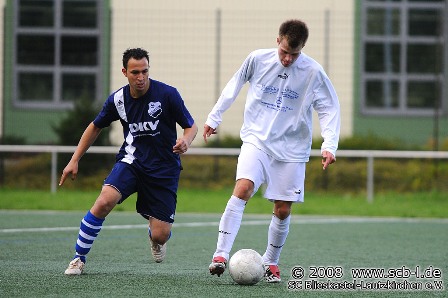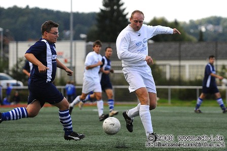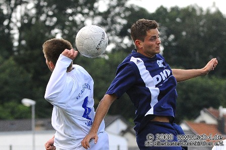 Die Wölfe kamen nach Blieskastel und wer sich an das Rückspiel in der letzten Saison in Wolferheim erinnerte, der wird mit gemischten Gefühlen den Weg auf den Sportplatz an die Florianstraße angegangen haben: Damals gab es eine Reihe unschöner Szenen am Spielfeldrand und vor allem die Wolfersheimer Zuschauer machten seinerzeit nicht gerade Werbung für den zugegebenermaßen schönen Ort im Bliesgau. Nun stand das brisante Duell in der Relegationssaison zum ersten Mal auf dem Terminkalender: Nach zwei Kerwesiegen bei der eigenen Kirmes gegen Breitfurt und in Bierbach gegen den heimischen BFC konnte der SC mit einem nun etwas praller gefüllten Punktekonto mit viel Selbstvertrauen in das Duell mit den Wölfen gehen. Wolfersheim dagegen kann mit dem Saisonstart nur bedingt zufrieden sein: Viele Verletzte schwächten den SV genau wie den SC und mit 6 Punkten aus 6 Spielen ist Bilanz des SV alles andere als makellos: Ein brisantes Duell also: Das vom ehemaligen SC-Trainer Horst Wenzel betreute Wolfersheim musste eigentlich siegen um den Anschluss an die Aufstiegsplätze herzustellen, dem SC ging es nicht anders wollte man sich unter den Top 5 der Tabelle etablieren. Viel Zündstoff also zunächst gestaltete sich die Partie an der Florianstraße aber alles andere als ereignisreich und für die rund 100 Zuschauer gab es wenig zu sehen: Chancen hier und da, aber kaum erwähnenswertes und erst ein Fernschuss brachte dann das erste Tor: Wieder war Blieskastel völlig unverständlicherweise in Durchgang eins viel zu passiv, nicht aggressiv genug und genau für diese Passivität und Schläfrigkeit wurde der SC nach einer viertel Stunde vor den eigenen Fans bitter bestraft, als Markus Eifler die Wölfe mit 1:0 in Front schießt. Was war los mit dem SC? Wieder in den Zweikämpfen kaum präsent und wieder war es viel Glück und einem überragenden Robert Harder zu verdanken, dass der SC zur Pause nur mit 0:1 im Hintertreffen lag. Offensiv kam vom SC wenig und auch defensiv leistete man sich zuweilen haarsträubende Fehler so, dass zu Pause eine verdiente Gästeführung stand. Blieskastel war also wieder im Hintertreffen und die SC-Fans hofften auf einen ähnlichen Weckruf wie er den SC schon in den Vorwochen des Öfteren in der Halbzeitpause ereilte.