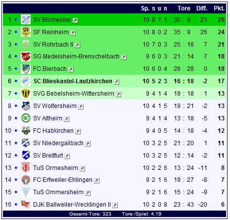 Ebenfalls um wichtige Punkte im Titelkampf musste der SV Blickweiler kämpfen, wollte man die Sportfreunde nicht vorbeiziehen lassen: Während es in der Vorwoche ein torloses Remis in Blieskastel den Vorsprung des SVB schmelzen lies, so musste beim Heimspiel gegen den SV Niedergailbach ein Dreier her um die Tabellenführung nicht abgeben zu müssen. Auch der SVN musste in der Vorwoche mit einem torlosen Remis gegen den TuS Ormesheim leben. Am Ende lies Blickweiler aber nichts anbrennen: Der SVB gewann souverän mit 4:1 und konnte somit seine Tabellenführung mit nun 25 Zählern vor den Sportfreunden aus Reinheim einen Punkt dahinter behaupten.