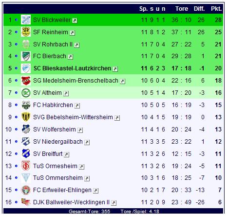 Das Überraschungsteam der Liga kommt derzeit aus Rohrbach: Der SVR II steht mit 21 Punkten auf dem dritten Tabellenplatz und wollte natürlich auch an diesem Wochenende gegen den SV Altheim punkten: Aber auch der SVA war auf dem aufsteigenden Ast: Zuletzt gab es zwei Siege: In Bebelsheim gewann man mit 2:1 und am vergangenen Sonntag konnte man bei einem 3:0-Erfolg in Medelsheim-Brenschelbach auf sich aufmerksam machen. Und siehe da: Der SVA konnte auch in Rohrbach feiern und sich am Ende verdientermaßen mit 4:2 durchsetzen. Mit Oliver Reitnauer konnte sich auch ein ehemaliger SCler in die Torschützenliste eintragen. Damit rückt der SVA auf Platz 7 vor, der SVR II bleibt dagegen auf dem dritten Platz, die Verfolger aus Bierbach in Blieskastel, die beide siegreich waren rücken aber näher.