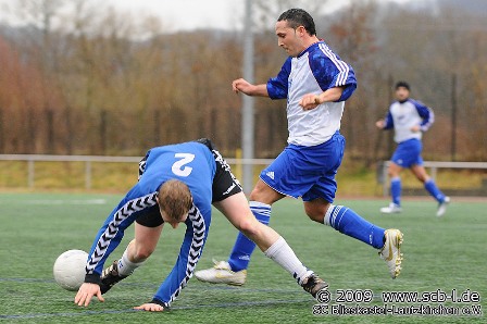 Ebenfalls zwei Sorgenkinder der Liga trafen in Frauenberg aufeinander: Die heimsche deutsch-französische Spielgemeinschaft hatte vor dem Rückrunde wieder Hoffnung bekommen,war man doch durch die zusätzlichen Aufsteigsplätze wieder in Schlagdistanz zu den Relegationsplätzen gekommen. „Wir haben natürlich höchst erfreut auf die Nachricht von der Erhöhung der Aufsteiger reagiert. Jetzt haben wir wieder eine reelle Chance, doch noch in die Bezirksliga zu kommen. Allerdings hatten wir im bisherigen Saisonverlauf mit großem Verletzungspech zu kämpfen.“, erklärte Habkrichens Spielausschussvorsitzender Walter Hess vor dem Rückrundestart. Die Realität sah aber zunächst anders aus: Im ersten Spiel nach dem Jahreswechsel verlor man in Ommersheim völlig verdient mit 2:0. Auch in Breitfrut gibt es derzeit wenig Grund zum Jubeln: Der SVB startete mit Interims –Trainer Klaus Gentes mit einer 0:2-Schlappe gegen den SV Altheim in 2009. Damit steht vor dem direkten Aufeiandertreffen also für beide Teams viel auf dem Spiel: Breitfurt auf Platz 15 und Habkirchen auf Platz 12 kämpfen um die wirklich allerletzten Chancen auf einen Bezirksliga Platz. Endlich sollte es aber für den FCH klappen: Habkrichen feierte einen 3:1-Erfolg, der den FC auf Platz 11 vorschiebt. Der Abstand zum Relegationsplatz 8 bleibt aber mit 10 Punkten doch recht groß. Der SV Breitfurt steht dagegen vor dem Lokalderby auf eigenem Platz gegen den SC Blieskastel-Lautzkirchen mit 11 Punkten auf dem zweitletzten Tabellenplatz und kann den Aufstieg schon lange abhaken.