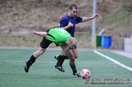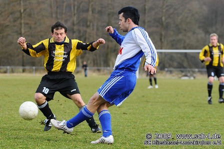 Ebenfalls ein Vorentscheidendes Duell im Kampf um die Aufstiegsplätz stieg in Blickweiler: Der SV Blickweiler empfing mit der SVG Bebelsheim-Wittersheim eine Mannschaft, die sich längst in der Riege der Aufstiegsaspiranten etabliert hat. Somit blickte man im ganzen Bliestal gespannt auf die Partie des SVB gegen die SVG. Für Blickweiler begann die Partie zunächst nach Maß: Eine Chance in der ersten Minute wurde schön herausgespielt und lies das Potential des SVB erahnen. Dann aber der Schock: Ein Stellungsfehler bei einem hohen Ball sorgte dafür, dass der SV Blickweiler in Rückstand gerät. Kastriot Zymeri war es, der in der 10. Minute das Spielgerät über SVB-Schlussmann Jean-Michel Caillas ins Tor befördert. War der SV Blickweiler etwa in Gefahr sein erstes Heimspiel zu verlieren? Es sah so aus, denn Bebelsheim lieferte in der Anfangsphase eine gute Partie ab und war dem Spitzenreiter sogar leicht überlegen. Nach dem Führungstor ließen die Gäste aber etwas nach: Blickweiler übernahm das Kommando und es schien, als hätte würden bei der SVG schon jetzt die Kräfte schwinden: Schnelle Angriffe über die pfeilschnelle Außenpositionen stellten die Gäste vor Probleme, die sie zunächst mit viel Glück lösen konnte. Ein Weitschuss von Jochen Ropönus war es dann, der die SVB-Anhänger endlich jubeln lies: Aus 25 Metern zimmert er in der 26. Spielminute den Ball in die Maschen, wenngleich der Ball nicht unhaltbar erschien, so war es doch eine tolle Einzelaktion, die den Ausgleich für den SVB besorgte. Aber Blickweiler war mit dem Ausgleich noch lange nicht zufrieden und stürmte weiter auf das SVG-Gehäuse, während Bebelsheim kaum noch zu eigenen Offensivaktionen kam.