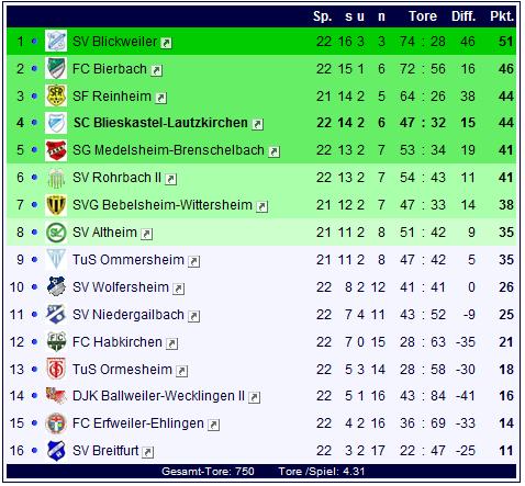 " Bis zur 53. Minute lag Spitzenreiter Blickweiler gegen Altheim durch Tore von Klaus Schunck (20./31.) und Rüdiger Hauck (52.) mit 0:3 zurück. Dann startete der Tabellenführer eine furiose Aufholjagd und konnte nach Toren von Marco Becker (53./80.) sowie Sascha Scherchel (88.) noch eine gerechte Punkteteilung erreichen."