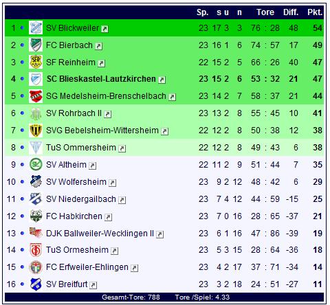 Einen wichtigen Sieg landete vor Wochenfrist der SC Blieskastel-Lautzkirchen: Ein 1:0-Sieg bei den Wölfen aus Wolfersheim sorgte dafür, dass der SC mit 44 Punkten mit den Sportfreunden auf Reinheim gleichzieht. Nun empfing der bis dahin auf Kunstrasen in 2009 punktlose SC den TuS Ormesheim. Der TuS gewann in der Vorwoche das Duell gegen den FC Habkirchen-Frauenberg mit 2:1 und hat damit nach der bösen 0:8-Schlappe in Altheim wieder ein wenig Selbstvertrauen getankt. „Heute spielte Not gegen Elend", zeigte sich der TuS-Doppeltorschütze Tobia Andres aber wenig begeistert über den Erfolg, obwohl dieser ein grandioses Comeback nach schwerer Verletzung feierte: Zwei entscheidende Tore sind ein traumhafter Einstand, der doch für ein wenig Optimismus sorgt: „Wir haben derzeit sehr viele Verletzte, so dass uns die A-Jugend aushelfen muss. Unser Sieg war heute verdient. Hoffentlich kehrt nun das Selbstvertrauen in die Köpfe der Spieler zurück". Ob es für den TuS auch in Blieskastel zu einem Sieg reicht, bleibt abzuwarten, fest steht: Blieskastel muss punkten, will man im Kampf um die Aufstiegsplätze am Ende nicht unnötig zittern und bis zum letzten Spieltag den Rechenschieber griffbereit haben. Schon nach drei Minuten brachte Jörg Leonhardt den SC nach einem an sich selbst verschuldeten Foulelfmeter in Front, bevor ein Hattrick von Flavio Baier für die deutliche 4:0-Pausenführung sorgte. Ormesheim war nach einer Gelb-Roten Karte beim Stande vom 3:0 dezimiert und hatte dem SC auch in Durchgang zwei wenig entgegenzusetzen. Erneut Baier und Fröhlich sorgten für das deutliche 6:0-Endergebnis. Blieskastel festigt damit seinen vierten Tabellenplatz, Ormesheim rutscht auf Platz 13 ab.