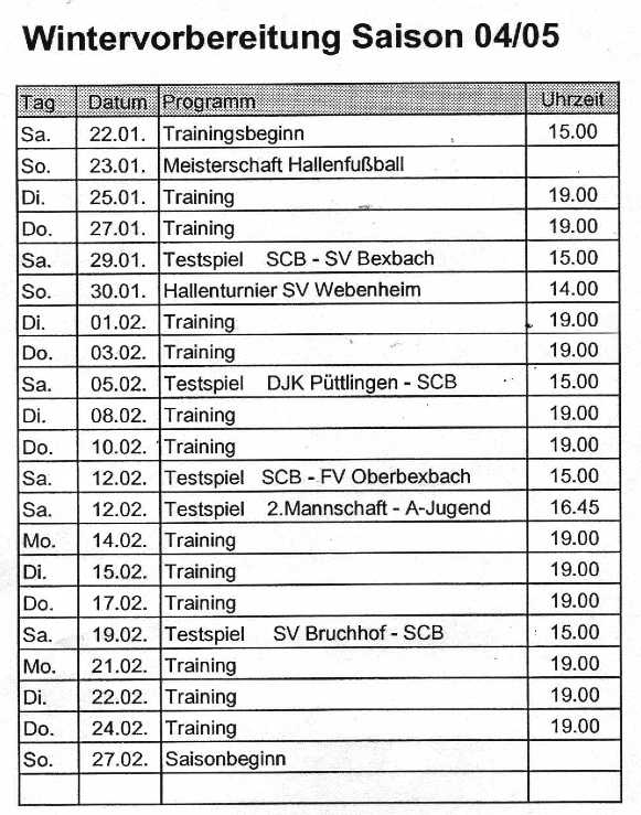 Am 22. Januar 2005 beginnt für die Aktuere des SCB schon wieder die Vorbereitung auf die Rückrunde der Saison. Auf dem Programm stehen neben zahlreichen Trainingseinheiten auch zwei Hallenturniere und zahlreiche Testspiele gegen zum Teil auch höherklassig spielende Gegner.