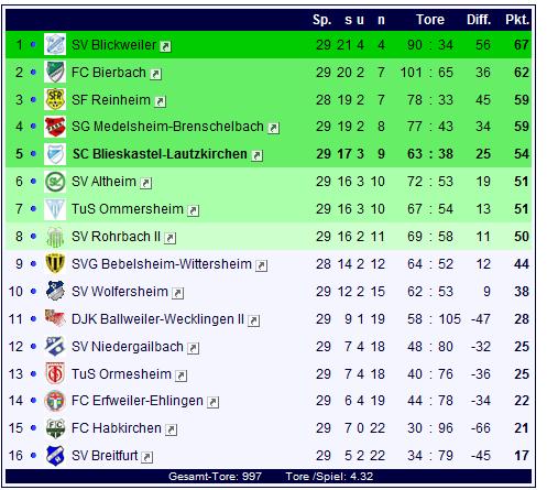 Das Überraschungsteam der letzten beiden Wochen kam aus Breitfurt: Der SVB gewann nach langer Durststrecke gleich zwei Mal in Folge und der 4:3-Sieg in der Vorwoche beim TuS Ormesheim sollte dem Tabellenletzten Selbstvertrauen geben. Das war auch bitter nötig, kam doch der Tabellenführer nach Breitfurt. Aber auch Blickweiler zeigte zuletzt Schwächen: Gegen Ommersheim verpasste man es bei der 1:2-Heimschlappe in der Vorwoche, den Titel frühzeitig klar zu machen und so wurde die Entscheidung vertagt. Eine Entscheidung getroffen hat dagegen SVB-Schlussmann Jean-Michel Caillas, der auch in der kommenden Saison den Kasten des SVB möglichst sauber halten will. Die Frage, die sich die ganze Liga stellte, war nun: Würde der SV Blickweiler in Breitfurt seinen Titel endlich klar machen, oder würde der SV Breitfurt für die Sensation sorgen und es am letzten Spieltag ein grandioses Meisterfinale zwischen Bierbach und Blickweiler geben? Blickweiler schien aber von Beginn an gewillt, in Breitfurt den letzten Zweifel am Titelgewinn zu beseitigen: Nach 30 Minuten erzielte Marco Becker das 1:0 für die Gäste. Aber Breitfurt wollte dem SVB die Aufgabe nicht leicht machen und so blieb es gegen kampfstarke Hausherren bis zur Pause beim knappen 1:0. Nach dem Seitenwechsel war es dann ein Foulelfmeter nach 65 Minuten, der für die Vorentscheidung sorgte: Sascha Scherschel erzielte das 2:0 und nun war der SV Blickweiler endgültig auf Titelkurs. Dass Christian Müller nach 80 gespielten Minuten auf 3:0 erhöhte, machte den Meisterjubel beim SV Blickweiler noch lauter. Dann war es endlich soweit: Der SV Blickweiler war Meister und was folgte, war ein langer Autocorso und eine noch längere Party-Nacht. Herzlichen Glückwunsch an den SV Blickweiler für den verdienten Titelgewinn!