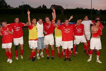 Der SV Reiskirchen bejubelt ausgelassen den Aufsteig in die Landesliga (Foto: Spanier / saarkicker.de)