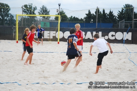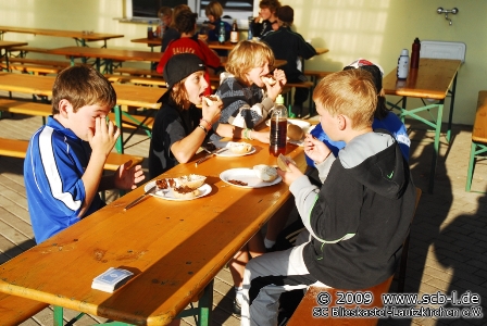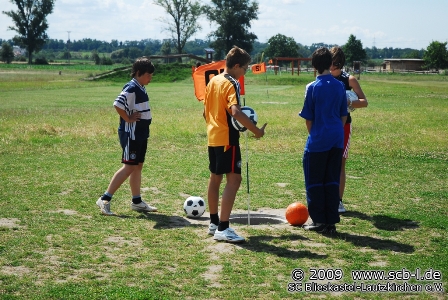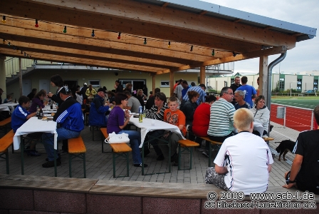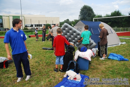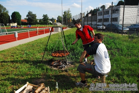 Es ist eine tolle und lange bewahrte Tradition beim SC Blieskastel-Lautzkirchen, dass die Kleinsten ihren Saisonabschluss mit einer großen Abschlussveranstaltung gemeinsam feiern. Nachdem die C-Jugend des SC Blieskastel-Lautzkirchen ihr Zeltlager bereits vor zwei Wochen absolvierte, waren nun die Nachwuchskicker von der G-Jugend bis hin zur D-Jugend dran und auch für die hatten sich Jugendleitung und die Trainer beim Zeltlager 2009 etwas ganz besonderes einfallen lassen: Wie seit einigen Jahren üblich traf man sich am Freitagabend des Zeltlagers mit Eltern, Geschwistern, Großeltern und Freunden an der Florianstraße zum riesigen Jugendabschlussgrillen, das gleichermaßen Auftakt für das große Jugendzeltlager 2009 war. Und wie sollte es auch anders sein: Wenn die Jugendabteilung des SC einlädt, dann lassen sicher die Nachwuchskicker nicht zweimal bitten: Über 75 Kinder und mehr als 100 Eltern und Großeltern versammelten sich an der Florianstraße und es herrschte reges Treiben bei pünktlich zum Startschuss für das Zeltlager immer besser werdendem Wetter: Die Kids beschlagnahmten erwartungsgemäß den Sportplatz, während es sich die Erwachsenen am Spielfeldrand beim gemütlichen Plausch zum Rundenende bei Gegrilltem und Salaten gut gehen ließen. Die Stimmung war bestens und für die Vorzeichen für ein rundum perfektes Zeltlager waren gegeben.