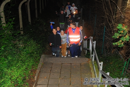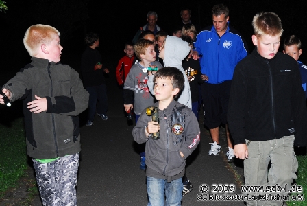 Die Aufregung steig: Der Einzug in die Zelte stand kurz bevor und besonders den Kleinsten von der F-Jugend war eine gewisse Nervosität anzumerken, als es gegen 22:30 Uhr dann hier: „Auf zur Nachtwanderung“ und die Jugendtrainer die F- und E-Jugend auf eine spannende Reise durch das nächtliche Blieskastel einluden, die die Jugendspieler natürlich gerne annahmen. Für die nicht minder aufgeregten Eltern hieß es dagegen Abschied nehmen und die Kids in die Obhut der Trainer und Betreuer zu übergeben. Die Kids der F- und E-Jugend begaben sich also auf ihre Nachtwanderung, während die D-Jugendlichen mit ihren Trainern ihr traditionelles Flutlichtspiel absolvierten. Und schon hier wurde das Konzept des Zeltlagers 2009 klar: Blieskastels mittlerweile über 150 Mann starke Jugendfamilie feierte zusammen den Abschluss, aber nicht ohne jeder Altersgruppe ein altersgerechtes Programm anzubieten. Die Nachtwanderung führte den SC durch die dunkelsten Ecken der Stadt und dem einen oder anderen Kicker war anzumerken, dass so etwas keinesfalls alltäglich ist. Am Sportplatz angekommen ging es dann unter die Dusche und mehr oder weniger schnell in die Schlafsäcke und Zelte. Bis auf die Betreuer der Nachtwache am Lagerfeuer fanden auch alle SCler in ihrer ersten Nacht in Zelten recht schnell und gut in den Schlaf.