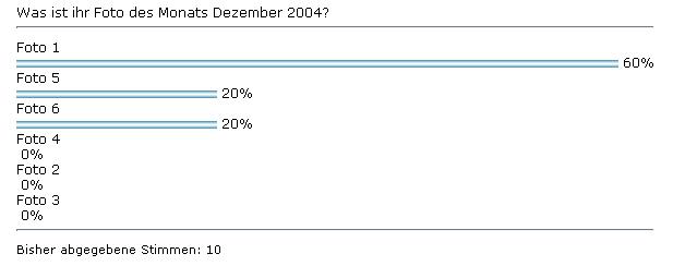 Die Wahl zum Bild des Monats Dezember 2004 ist zu Ende zum Bild des Monats wurde unser Foto 1. Die Wahl zum Foto des Monats Januar 2005 ist ab sofort online.