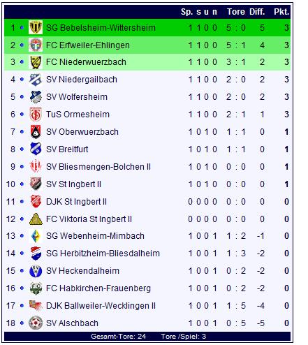 Hier der Überblick über die bisher absolvierten Partien der ersten Spieltages, die einige erste Erkenntnisse über die Stärke und die Kräfteverhältnisse der neuen Kreisliga A Bliestal offenbarte: