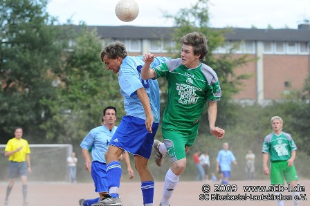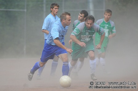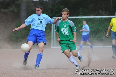 Auch die Partie hatte zunächst nicht das allerhöchste Niveau. Naturgemäß stand der SC, der als klarer Außenseiter ins Rennen ging tief und wollte aus einer sicheren Defensive heraus gegen die Oberliga-Reserve agieren. Mit Georg Amann, Herbert Stuhlberg, Sascha Zott und Wladimir Otto standen vier Oberliga Spieler im Kader des FCH. Mehr war nicht möglich erhielten doch einige Ergänzungsspieler beim Pokalauftritt in Erfweiler-Ehlingen ihren Einsatz und waren somit nicht spielberechtigt. Vier A-Jugendspieler komplettierten die Formation des FCH II. Homburg hatte gleich zu Beginn mehr Ballbesitz, aber auch die Akteure des FCH hatten Probleme mit dem Geläuf und echten Kombinationsfußball gab es nicht zu sehen. Personalsorgen dagegen beim SC: Mit Flavio Baier, Simon Kiefer, Frank Konrad, Pattrick Stumpf und Jörg Leonhardt musste der SC auf eine halbe Mannschaft verzichten und so war es schon vorher klar, dass der Weg für den SC an diesem Nachmittag nur über den Kampf gehen konnte. In der Defensive standen beide Mannschaften zunächst sehr sicher und ließen kaum Tormöglichkeiten zu. Blieskastel wurde nach und nach ein wenig mutiger, als man erkannte, dass auch Homburg die Ideen im Offensivspiel fehlten. Ein langer Ball war es dann, den FCH-Keeper Georg Amann nur mit einem hohen Bein klären kann. Die logische Folge ein indirekter Freistoß für den SC: Marco Fröhlich legt auf Kushtrim Agaj und der verwandelt souverän zum umjubelten 1:0 für den SC. Blieskastel hatte nun Oberwasser und Homburg war von der Rolle: Agaj traf den Pfosten und köpfte wenige Sekunden später nur Zentimeter am, Gehäuse vorbei. Der FCH war um Kontrolle bemüht zeigte sich aber in der Offensive schwach und kam zu keiner guten Tormöglichkeit. Blieskastel verteidigte konsequent und stellte die FC-Akteure vor unlösbare Aufgabe: Ein Zufallsprodukt brachte den SC dann um die Führung, als eine Freistoßflanke unglücklich vom Hinterkopf eines SClers ins netzt trudelt. Ein aus SC-Sicht denkbar unglücklicher Ausgleichstreffer für den FCH nach 35 gespielten Minuten. Homburg hatte nun das Spiel wieder besser unter Kontrolle, erspielte sich aber keine Möglichkeiten. Zur Pause war für den Sc beim Stande von 1:1 noch alles drin.