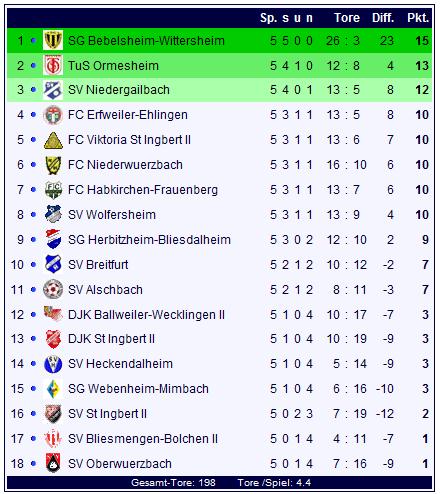 In der Tabelle hat sich nicht viel getan: Die SVG Bebelsheim-Wittersheim dominierte die Liga auch in dieser Woche eindrucksvoll und machte der Konkurrenz eines klar: Auch wenn man sich noch in der Anfangsphase der Runde befindet, so wird der Weg zum Titel mit großer Sicherheit über die SVG gehen und die hat derzeit einfach einen überragenden Lauf, wie es so schön heißt. Noch immer ist man frei von Verlustpunkten und die Tabellenspitze bleibt so auch an diesem Spieltag unangetastet. Auch im Tabellenkeller bleibt alles beim Alten: Oberwürzbach und Bliesmengen bleiben im Rennen um die Rote Laterne, wobei der SVO immer noch die Nase vorn hat.