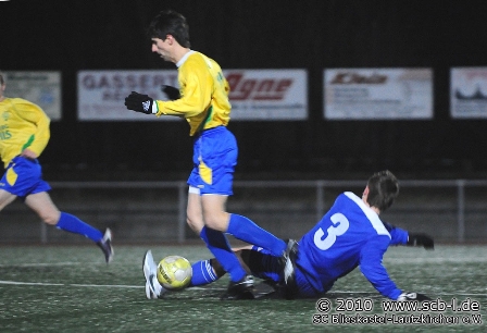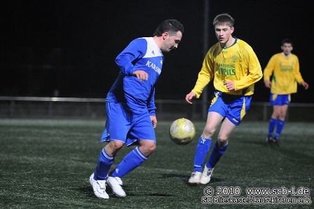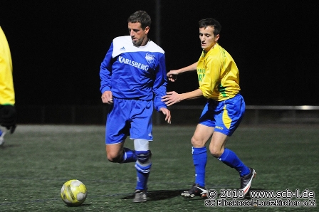 Für Blieskastel waren die Voraussetuungen wahrlich andere, konnte doch der SC aus zwei Spielen im Jubläumsjahr 2010 erst einen Zähler vom Remis gegen Beeden verbuchen und verlor in der Vorwoche ein wichtiges Sechs-Punkte-Spiel um den Klassenverbleib in Altheim. Nun war Blieskastel unter Druck und ein Punktgewinn gegen den sicherlich haushohen Favoriten vom FCH wäre für den SC auch für das angeschlagene Selbstvertrauen sicherlich Gold wert. Dementsprechend motiviert sollten die SCler also in das wichtige Flutlichspiel an der Florianstraße gehen. Auch wenn Experten mit einem FCH-Erfolg rechneten, so wollte Blieskastel die Außenseiterchance nutzen. Zunächst war es der FC 08 Homburg, der an diesem Mittwochabend neben einigen A-Jugendspielern die Altbekannten Panella, Di Dio Parlapoco, Stuhlberg und Keller ins Rennen schickte und die Initiative übernahm. Homburg hatte ein deutliches Plus an Ballbesitz und versuchte die Partie von Beginn an zu kontrollieren. Blieskastel dagegen kam erst nach einigen Minuten in die Gänge und die Taktik des SC war schnell klar: Hinten stand die Leonhardt-Elf sicher, ließ wenige Chancen zu und zwang die Oberliga-Reserve so zu Fehlpässen, die man mit schnellen Gegenstößen und Flankenwechseln überbrücken wollte. Immer wieder hatte der FCH mit diesem wirksamen Mittel des SC seine Probleme und offenbarte den einen oder anderen groben Stellungsfehler in der Defensive, den Blieskastel zu nutzen versuchte. Nach und nach wurde die Partie ausgeglichener und beim FCH ließ die Passgenauigkeit mehr und mehr nach. Dann aber folgten verhängnisvolle 60 Sekunden für den SC: Zwei eigentlich harmlose Schüsse von Panella und Di Dio Parlapoco landeten im SC-Tor und siehe da – trotz bis dahin ansehnlicher Leistung lag Blieskastel wie aus dem Nichts mit 0:2 im Hintertreffen. Ein denkbar unglücklicher Spielverlauf für den SC.