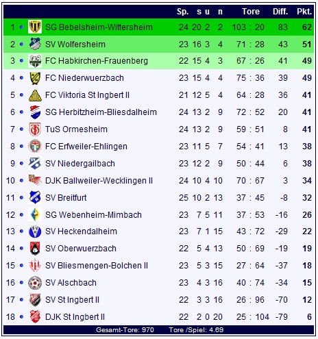 Der SV Heckendalheim unterlag vergangenes Wochenende der bis dahin wenig erfolgreichen DJK St. Inbgert II mit 0:2. Im Nachholspiel unter der Woche gegen den SV Bliesmengen-Bolchen II hieß es am Ende Spielabbruch und so blieb es für den bei 22 Punkten und dem 13. Platz. Die SVG Bebelsheim-Wittersheim fuhr gegen die SG Herbitzheim-Bliesdalheim einen 4:0-Sieg ein und baute als Spitzenreiter ihr Punktepolster auf 11 Zähler aus. Das Hinspiel konnte die SVG mit einem knappen 2:1 für sich entscheiden. Zwei Treffer von Admir Ramic in der 5. und 15. Minute sorgten für eine 2:0-Pausenführung der SVG. Nach dem Seitenwechsel gelang Dany Ihl zunächst der Anschlusstreffer, bevor Bebelsheims Schlussoffensive gezündet wurde: Zunächst stelle Andreas Fries den alten Abstand wieder her, ehe Karsten Guckert, Andreas Fries und zwei weitere Teffer von Admir Ramic das Resultat auf 7:1 in die Höhe schraubten. Einen deutlichen 7:1-Auswährterfolg durfte man bei der SVG Bebelsheim-Wittersheim am Ende feiern, dich mit 62 Punkten weiterhin Spitzenreiter bleibt. Heckendalheim steht mit 22 Zählern auf dem 13. Platz der Rangfolge.