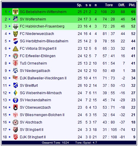 Die Tabellenspitze ließ sich natürlich nicht lumpen und die Teams aus Bebelsheim-Wittersheim, Wolfersheim, Habkirchen-Frauenberg und Niederwürzbach siegten erneut einvernehmlich, sodass sich ganz oben im Klassement nichts änderte, lediglich je drei Punkte müssen zu den Kontostände der Spitzenteams addiert werden. Ein kleines Loch klafft hingegen vor dem fünften Rang: Die SG Herbitzheim-Bliesdalheim hat nun schon 10 Punkte Rückstand auf den Relegationsplatz.