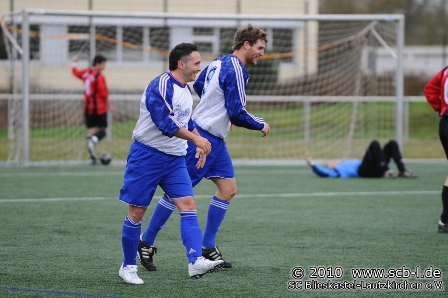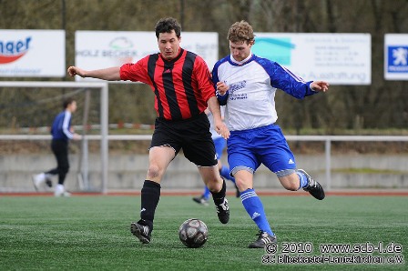 Bei wunderschönem Osterwetter fanden sich am Ostermontag über 100 Zuschauer an der Florianstraße zu Blieskastel ein und sahen einen Blitzstart des SC: Gegen vollkommen indisponierte Gäste war es Patrick Stumpf, der nach gerade einmal 150 Sekunden mit einem abgefälschten Freistoß zum 1:0 einnetzte. Blieskastel hatte den Sportfreunden im wichtigen Sechs-Punkte-Spiel sofort einen Tiefschlag versetzt und blieb gegen unsicher wirkende Gäste am Drücker: Nur 240 Sekunden später war es Marco Fröhlich, der zum 2:0 traf und damit fast schon eine Vorentscheidung erzielte. Walsheim war völlig von der Rolle und brauchte einige Zeit, ehe man nach dem frühen Doppelschlag selbst zu Offensivaktionen kam. Gegen nur ein wenig nachlässiger werdende Hausherren erspielten sich die Sportfreunde erste Torchancen, kamen aber gegen die sichere SC-Defensive nicht zum Torerfolg. Der SC braucht ein wenig um wieder in die Gänge zu kommen schlug dann aber erneut doppelt zu: Flavio Baier erhöhte nach 36 Minuten auf 3:0, ehe Youngster Julian Müller nur 180 Sekunden später zum 4:0 abschloss. Walsheim war nun endgültig geschlagen und wurde nach 45 Minuten erlöst, als der Unparteiische Volkmar Fischer die Teams in die Pause schickte. Blieskastel hatte die Partie bereits entschieden und Walsheim wirkte in einem wichtigen Sechs-Punkte-Spiel unglaublich willenlos.
