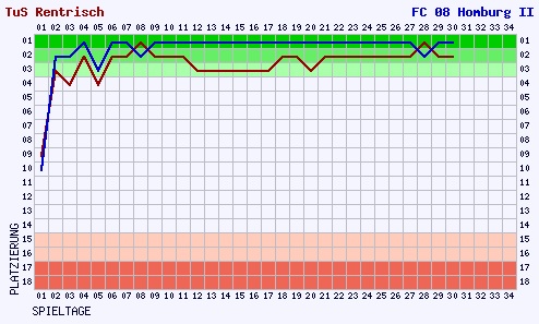 Es wird also vermutlich bis zum Saisonende spannend bleiben, wer sich den Titel und den damit verbundenen Direktaufstieg in die Landesliga Nordost sichern wird. Ein echtes Meisterfinale am letzten Spieltag ist somit durchaus möglich. Fest steht: Sowohl Rentrisch als auch Homburg bissen sich über die gesamte Saison hinweg an der Spitze der Tabelle fest und haben sich somit verdientermaßen als letzte Wettstreiter um den Ttitel etabliert, wie die Fieberkurve beider Teams zeigt: