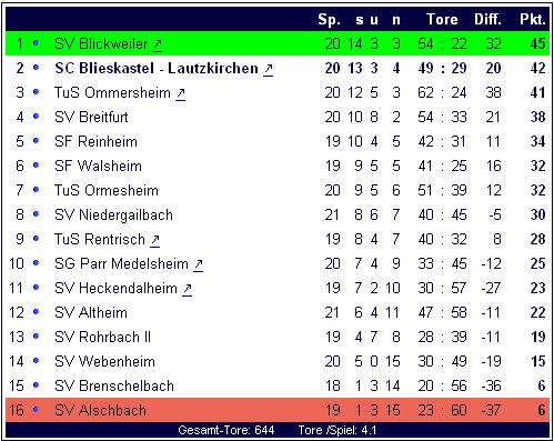 Um weiter den Anschluss an den SV Blickweiler zu halten wäre für beide Teams am Sonntag ein Sieg unheimlich wichtig. Der SV Breitfurt könnte mit einem Sieg bis auf einen Punkt an den SC Blieskastel-Lautzkirchen herankommen. Allerdings ist der SV Breitfurt die Mannschaft mit den wenigsten Niederlagen in der Kreisliga A Bliestal. Erst zwei mal konnte das Team aus Breitfurt bezwungen werden (2:6 gegen Niedergailbach 11. ST; 0:2 gegen Heckendalheim 13. ST beide Spiele auswärts) und man ist seit nunemhr 7 Spielen ohne Niederlage. Aber die Statistik des SCB ist nicht weniger beeindruckend: Der SCB ist nun in 6 Spielen in Folge als Sieger vom Platz gegangen. Also zumindest die Statistik lässt auf ein echtes Spitzenspiel hoffen nachdem die Situation an der Tabellenspitze bestimmt um einiges aussagekräftiger sein wird.