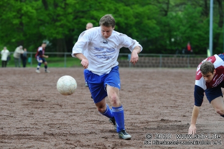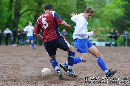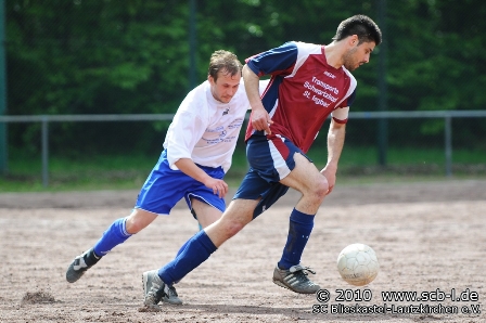 Nach der Pause verstärkte der TuS seine Offensivbemühungen, wollte man sich doch mit einem Sieg eine gute Ausgangssituation vor dem schweren Auswärtsspiel auf neutralem Platz beim abstiegsbedrohten SV Altheim verschaffen. Blieskastel blieb aber kampfstark und machte dem TuS das Leben schwer. Blieskastel spendierte dieser Partie genau die Zutaten, die in den Abstiegskampf gehören, kassierte dafür aber auch die eine oder andere gelbe Karte, was sich in der Folge rächen sollte: Der gelb-vorbelastete SC-Libero Markus Grötsch musste in einem Zweikampf zum Foul greifen und wurde folgerichtig des Feldes verwiesen. Nun galt es für den SC mehr als 20 Minuten in Unterzahl zu bestehen und das zu allem Überfluss beim Spitzenreiter aus Rentrisch. Aber Blieskastel ließ sich von diesem Rückschlag nicht aus dem Konzept bringen und verteidigte die Null in der Defensive mit vereinten Kräften, ehe Kristian Kropp für Jubelstürme bei den TuS-Fans sorgte, als er seine Elf mit 1:0 in Front schoss. Nun war die Situation des SC nicht unbedingt die beste: Mit einem MannUnterzahl war man beim Spitzenreiter mit 1:0 in Rückstand und benötigte im Abstiegskampf eigentlich einen Punkt aus dieser Partie. Die Lage war also fast aussichtlos, aber es zeichnete den SC in dieser Partie aus, dass man nicht etwa in seine Einzelteile zerfiel, sondern weiter versuchte das Aufbausspiel des TuS früh zu stören und die treffsichere Offensivreihe des Spitzenreiters vom eigenen Tor fernzuhalten. Dann aber begann der SC, der nun Patrick Stumpf für Sven Sandmeyer brachte plötzlich selbst offensiv aktiver zu werden und siehe da, eine der wenigen Offensivaktionen wurde belohnt: Flavio Baier setzt sich gleich gegen drei TuS Akteure durch und kann im Strafraum nur durch ein Foul gestoppt werden. Ein Foulelfmeter war die logische Konsequenz und den verwandelte der eingewechselte Patrick Stumpf souverän zum 1:1-Ausgleich. Die Karten waren also trotz Unterzahl für den SC wieder neu gemischt und den Fußballfans stand eine spannende Schlussphase bevor. Der SC hatte durch einen Stumpf Weitschuss und einige schnelle Gegenstöße seine Möglichkeiten, während der TuS weiter die letzte Konsequenz im Offensivspiel vermissen ließ. Die Zeit lief für den SC und die Schlussminuten wurde nochmals hitzig: Aufgrund eines Trikotgrabschers wurde wenige Minuten vor dem Ende auch SC-Akteur Christian Müller des Felder verwiesen und so ging es mit doppelter Unterzahl in die Schlussphase. Blieskastel verteidigte den möglicherweise wichtigen Punkt allerdings mit voller Einsatz aller mittlerweile nur noch neun SCler und brachte das 1:1-Remis somit über die Zeit. Ohne Frage hatte Rentrisch ein spielerisches Übergewicht, aufgrund der kämpferischen Leistung hat sich der SC diesen möglicherweise wichtigen Punkt allerdings verdient und hält damit die Spannung im Titelrennen, wenngleich auch leider im Abstiegskampf.