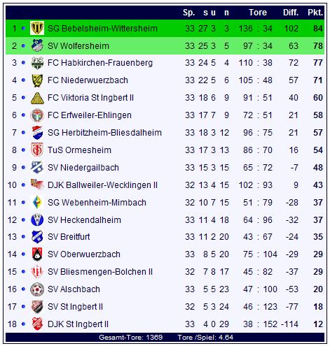 Die Saison ist noch nicht vorbei, und dennoch steht Dank einer erneuten englischen Woche seit Mittwochabend der Meister der Saison 2009/2010 fest: Die SVG Bebelsheim-Wittersheim sicherte sich mit einem 4:1-Erfolg beim FC Erfweiler-Ehlingen vorzeitig den Titel und belohnte sich damit selbst für eine überragende Saison, in der man den Platz an der Sonne nicht ein einziges Mal abgeben musste. Neben der Partie, auf die wohl die meisten Augen gerichtet waren, wurde jedoch auch an anderen Schauplätzen gekämpft und außer der SVG Bebelsheim-Wittersheim musste unter anderem auch der komplette Rest der Spitzengruppe ran, um um den immer noch offenen Relegationsplatz zwei zu kämpfen. Im direkten Duell zwischen dem SV Wolfersheim und dem FC Niederwürzbach zog der Gast vom FCN den Kürzeren und muss sich vom Traum, am Ende der Saison an der Relegation teilnehmen zu dürfen, verabschieden. So findet in den zwei verbleibenden Spielen ein Zweikampf zwischen den Wölfen und der deutsch-französischen Spielgemeinschaft aus Habkirchen-Frauenberg um die Relegation statt, in dem Wolfersheim aktuell mit einem Zähler mehr die Nase vorn hat. Nachholfußball von Dienstag bis Donnerstag also im Schnelldurchlauf: