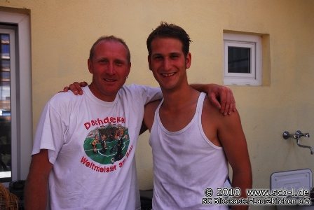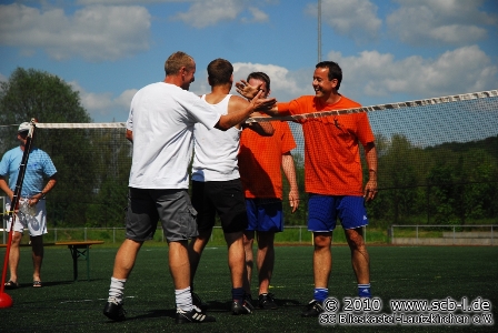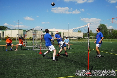 Zunächst stand das Spiel um drei auf dem Programm wo sich die Zweitplatzierten der Zwischenrunde gegenüberstanden: Die SF otzelot trafen auf die Schlosskicker und zeigten sehr unterhaltsames Fußballtennis. Am Ende wurde es knapp und spannend bis zum letzten Ballwechsel, ehe sich die Schlosskicker den dritten Platz sicherten. Beim strahlendem Sonnenschein stand nun das Finale auf dem Programm und die Finalisten vom Team Blau aufm Bau und den Torjägern boten eine ganz große Show: Zunächst gewann Blau aufm Bau den ersten Satz, bevor die Torjäger nach Sätzen ausgleichen konnten und es in den entscheidenden dritten Satz ging. Beide Teams wollten gewinnen und boten spektakuläre Ballwechsel am laufenden Band. Am Ende hatte Blau auf dem Bau in einem unglaublichen Finale die Nase vorn und gewinnt das 1. SCB-Open 2010.