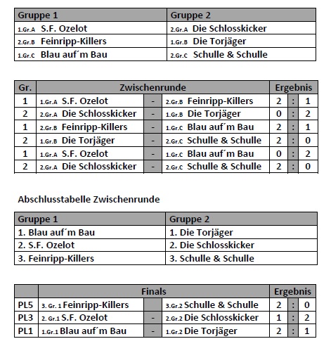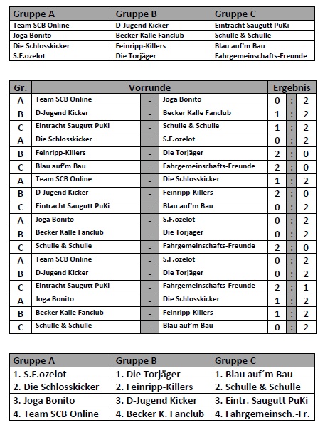 In Gruppen A gingen die SF otzelot, die Schlosskicker, Team Joga Bonito und das SCB-Online-Internetteam auf Punktjagd und am Ende fand die Gruppen mit den SF otzelot und den Schlosskickern ihre Teilnehmer für die Zwischenrunde. Spannende Spiele waren auf in Gruppe B geboten, wo die Torjäger, die D-Jugend-Kicker, die Feinripp-Killers und der Becker-Kalle-Fanclub zur Sache gingen. Am Ende konnte sich die Torjäger und die Feinripp-Killers, die alleine durch ihr Outfit die besonderen Akzente an diesem Nachmittag setzen, sich das Ticket für die Zwischenrunde sichern. Komplettiert wurde die Zwischenrunde durch die qualifizierten Teams aus der Gruppe C: Dort gingen die Eintracht Puki, das Team Blau aufm Bau und Schulle & Schulle und die Fahrgemeinschafts-Freunde ins Rennen. Durchsetzen konnten sich am Ende Schulle & Schulle und das Team Blau aufm Bau. Eine spannende und ereignisreiche Vorrunde hatte also ihre sechs Qualifikanten für die Zwischenrunde gefunden, Spaß hatten aber auch diejenigen Teams, die kein Ticket für die Zwischenrunde ergattern konnten.
