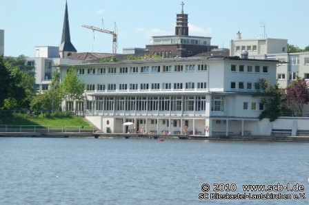Um 10:00 Uhr machte man sich auf den Weg und als erste Station stand für die SCler Darmstadt auf dem Programm. Dort kam man nach rund 2-stündiger Busfahrt in der Jugendherberge an und für die Jugendkicker sollte sich herausstellen, dass die SC-Reiseleitung, die zuvor eigens ein halbes Dutzend Jugendherbergen besichtigt hatte, schon bei der Auswahl der Jugendherberge eine ganz besondere Überraschung parat hatte: Das eigentlich unscheinbare Gebäude hatte eine unerwartet tolle Lage, die von außen nicht zu erahnen war, aber beim Beziehen der Zimmer offensichtlich wurde. Die Jugendherberge lag direkt an einem riesigen Badesee, mit dem die SC-Jugend wenig später Bekanntschaft machen sollte. Zunächst wurden also die Zimmer mit Meerblick bezogen, ehe man sich beim Mittagessen stärkte. Dann machte man sich auf zum besagten Badesee, wo man bei bestem Sonnenwetter echtes Urlaubsfeeling serviert bekam. In idyllischer Atmosphäre verbrachten die SCler bei Schwimmen, Fußball oder einfach beim Sonnenbaden einen erholsamen Nachmittag, ehe man mehr und mehr dem Highlight der Abschlussfahrt entgegenfieberte.