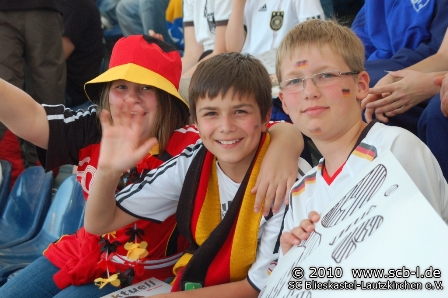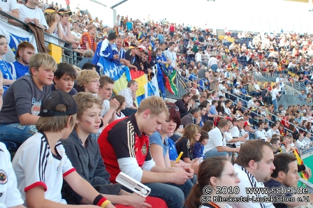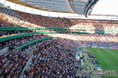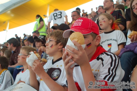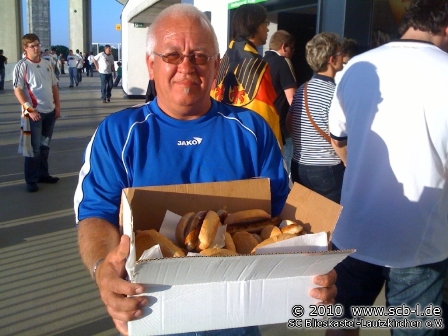 Die SCler machten sich also wieder auf den Weg zur Jugendherberge und machten sich bereit für das große Fußballevent: Mit Vuvuzela, Deutschlandtrikot, SC-Fahne und „Kriegsbemalung“ im Gepäck machtem sich die rund 50 Blieskastler dann auf zur Commerzbank-Arena. Die Fahrt dorthin gestaltete sich ob der katastrophalen Verkehrslage zwar schwieriger als angenommen, aber schließlich kam man doch sicher und pünktlich am Ort des letzten Vorbereitungsspiels der deutschen Fußball-Nationalmannschaft an. 48.000 Fußballfans waren zu Gast und ein wenig aufgeregt waren darunter auch die rund 50 SCler. In Block 43J fand man nach einem Weg durch tausende Fußballfans sein zu Hause und ließ sich gleich häuslich nieder. Für Verpflegung sorgte der SC-Betreuerstab, der mit der Rekordbestellung von 48 Rostwürsten und 48 Mineralwassern für einen weitgehenden Zusammenbruch der Elektronik des bargeldlosen Bezahlsystems sorgte. Mit vereinten Kräften wurde die Verpflegung zum SC-Fanblock gebracht und dann konnte es losgehen: Die Mannschaftsaufstellung wurde verlesen, die Teams liefen ein und dann war der große Moment da: 48.000 Fußballfans sangen die deutsche Nationalhymne und auch die SCler waren von diesem Moment sichtlich ergriffen. Auch für die Betreuer war es ein unvergesslicher Moment.