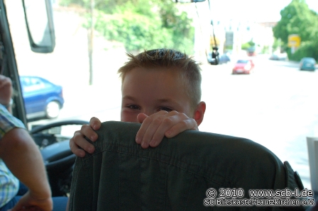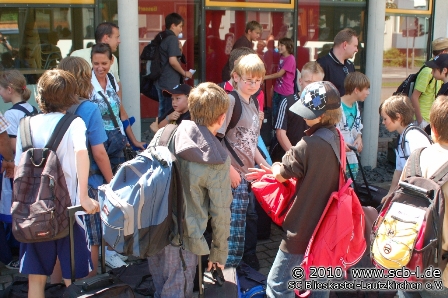 Was für ein Erlebnis für die SC-Jugend nebst Betreuern: Der SC Blieskastel-Lautzkirchen war zu Gast beim letzten Vorbereitungsspiel der deutschen Fußball-Nationalmannschaft vor dem Abflug nach Südafrika in der Commerzbank-Arena in Frankfurt. Aber alles der Reihe nach: Es war eine besondere Stimmung, als sich am frühen Donnerstagmorgen rund 40 SC-Nachwuchskicker und 10 Betreuer am SC-Sportplatz in Blieskastel versammelten. Das Ziel war klar: Es zog die SCler nach Frankfurt und schon am Abreisetag war der ganzen Reisegruppe die Vorfreude auf diesen ganz besonderen Jahresabschluss anzumerken. Als erster Programmpunkt stand das traditionelle gemeinsame Frühstück an der Sportanlage auf dem Programm des SC und war wie sooft die perfekte Einstimmung auf eine, wie sich herausstellen sollte, unvergessliche Abschlussfahrt. Um 9:30 Uhr ging es dann los: Der Reisebus nebst Busfahrer Christof Lauer stand auf der Matte und nun wurde es ernst. In Reih und Glied standen die SC-Nachwuchskicker parat, um in den Bus einzusteigen und die große Reise zu beginnen.