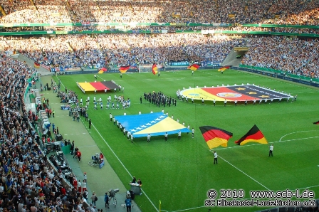 Dann ging es los und der Ball rollte, zunächst aber war es der Gast aus Bosnien-Herzegowina, der durch Wolfsburgs Stürmer Edin Dzeko mit 1:0 in Front gehen konnte. Auch zur Halbzeitpause blieb es beim Rückstand für die DFB-Auswahl, aber die Jugendkicker des SC wussten genau: Da geht noch was und die Nationalmannschaft schien die Anfeuerungen des SC gehört zu haben. „Steht auf, wenn ihr Deutsche seid“, hallte es durch die ausverkaufte Arena und dann ging es richtig los für die DFB-Elf: Kapitän Philipp Lahm brachte den Ausgleich und läutete damit einen echten Sturmlauf der Löw-Elf ein. Die Stimmung wurde immer besser und siehe da: Elfmeter für Deutschland, Schweinsteiger verwandelt… Jubel… aber nein, Wiederholung! Ärger auch bei den SClern, aber Schweinsteiger bleibt nervenstark und verwandelt ein zweites Mal. Der Jubel kannte nun keine Grenzen mehr. „Torschütze mit der Nummer 7 Bastian“…“SCHEINSTEIGER“ hallte es durch die Arena und den SC-Block und nur drei Minuten später war es das gleiche Spiel: Schweinsteiger trifft zum 3:1 und lässt die SCler mit ihrer Nationalelf jubeln. Deutschland war auf Siegkurs und spielte nun groß auf. Ein tolles Spiel, das mit einem 3:1-Erfolg für Deutschland endete. Nach dem Spiel wurde es hochemotional, verabschiedete Deutschland seine WM-Helden doch nach Südafrika und auch der SC-Nachwuchs wünschte viel Glück!