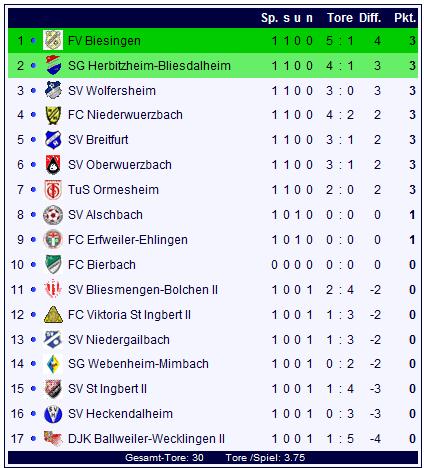 Die ersten Spiele der neuen Saison sind also gespielt, die ersten Punkte eingefahren, die ersten Niederlagen verwunden und lediglich Absteiger Bierbach muss sich noch gedulden, ehe auch er ins Ligageschehen eingreifen darf: