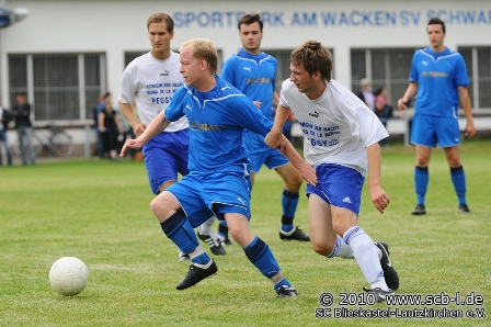 Die Partie auf dem Rasenplatz in Schwarzenbach verlief zunächst so, wie man es im Vorfeld erwartet hätte: Der SC Blieskastel-Lautzkirchen riss das Spielgeschehen an sich und ließ Ball und Gegner laufen. Der SC hatte ein deutliches Übergewicht und erspielte sich erste Chancen. Schwarzenbach dagegen verhielt sich passiv und empfing den SC in der eigenen Hälfte, vorne wartete zumeist nur ein SVS-Akteur. Dann die logische Konsequenz aus der drückenden SC-Überlegenheit: Eine Stumpf-Hereingabe kann zunächst abgewehrt werden, landet dann aber im zweiten Anlauf bei Peter Pusse der davon profitiert, dass Schwarzenbachs Schlussmann auf dem hohen Rasen ausrutschte. Pusse bedankte sich per Kopf mit dem 1:0. Der SC war somit nach nur sechs gespielten Minuten in Front, wie sich herausstellen sollte, tat diese frühe Führung dem SC aber nicht gut. Blieskastel-Lautzkirchen wurde nun im Spielaufbau nachlässiger und ließ die Zielstrebigkeit im Offensivspiel vermissen. So kam es, dass der bis dahin offensiv nicht aktive SVS plötzlich selbst zu Chancen kam. In der Defensivbewegung offenbarte der SC nun Schwächen und Schwarzenbach bedankte sich beim nachlässigen SC. Symptomatisch dann die Szene vor dem Ausgleich: Blieskastels Defensive vertändelt den Ball, setzt nicht konsequent nach und Schwarzenbach bedankt sich nach rund 30 gespielten Minuten mit dem 1:1-Ausgelich. Der SC hatte sich den Ausgleich selbst durch seine inkonsequente Spielweise zuzuschreiben, hatte man doch unmittelbar vor dem Ausgleich eine hundertprozentige Chance vergeben. Statt einer beruhigenden Führung war es nun ein Remis und bis zur Pause gelang es dem SC nicht auf den Ausgleich zu reagieren, obwohl man in der Offensive wieder deutlich aktiver wurde und wieder konsequenter agierte. So stand zur Pause ein Remis, das sich der SV Schwarzenbach nach einer schwachen Anfangsphase erarbeitet hatte, indem er die Nachlässigkeiten im SC-Spiel gnadenlos ausnutzte.