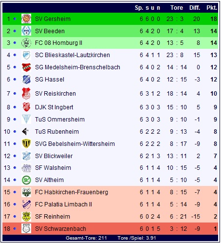 In der Tabelle bleibt der SV Gersheim ohne Verlustpunkt das Maß aller Dinge, dahinter bringen sich die Verfolger aus Homburg, Beeden und Blieskastel-Lautzkirchen in Position. Am unteren Tabellenende kämpfen Reinheim und Schwarzenbach schon jetzt gegen den Abstieg: