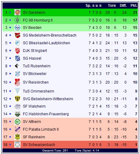 In der Tabelle bleibt der SV Gersheim mit 21 Punkten aus 7 Spielen das Maß aller Dinge, lediglich der FC 08 Homburg II kann ein wenig Schritt halten. Am Ende der Tabelle fällt Schwarzenbach weiter zurück und hat die rote Laterne fest in der Hand:
